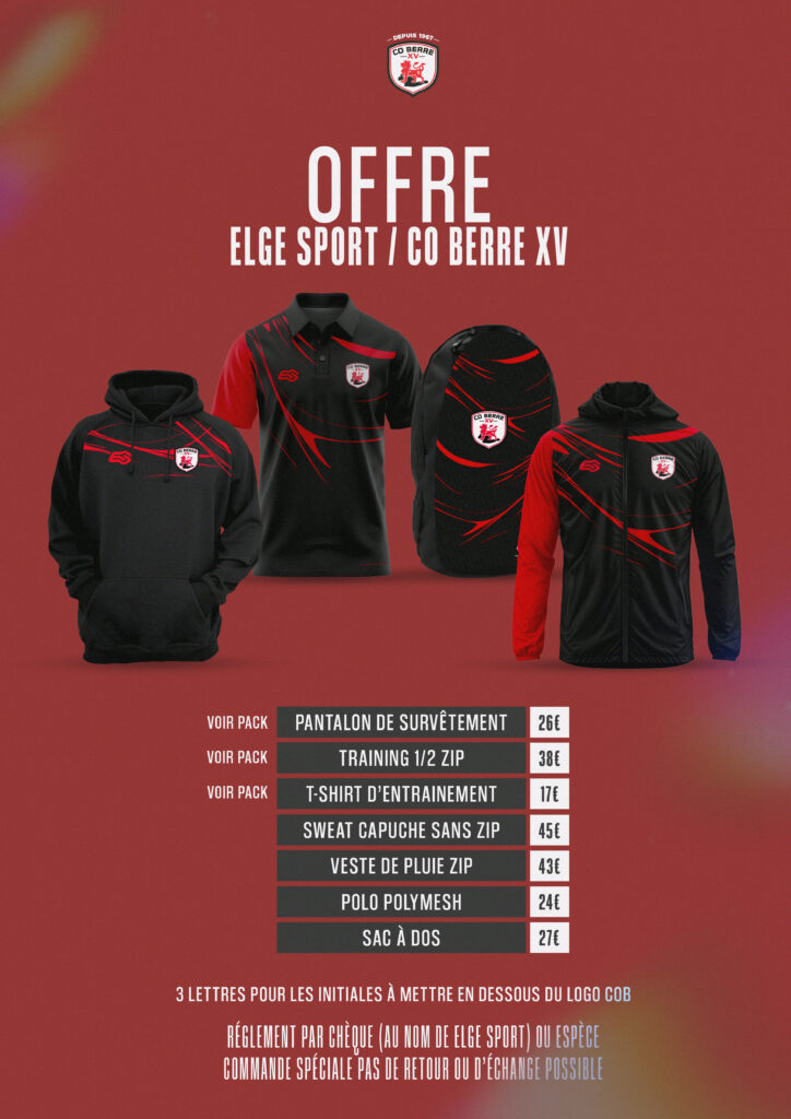 Le CO Berre XV est fier de vous présenter sa nouvelle collection officielle en partenariat avec ELGE SPORT. Des produits de qualité aux couleurs emblématiques rouge et noir du club, disponibles dès maintenant !